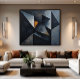 Kraftfull abstrakt komposition med överlappande trekantiga former i djup svart, skiffergrått och gyllene detaljer. Rik oljemålningstextur skapar djup och rörelse. Sofistikerat verk för moderna utrymmen som söker visuell påverkan och minimalistisk elegans.