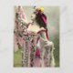 Ett gammalt färglagt fotografi av en ung mörkhårig kvinna i en blombeklädd klänning som intar en dramatisk pose. Blommor täcker också hennes hår. Färgerna är ljusrosa och djuprosa med en touch av gult.