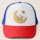 En surrealistisk och attraktiv vektordesign för tecknaden i ett enkelt, plant stil. En gigantisk krescerande måne i form av en sväng, med en sovande katt i, ovanför måne, utspridd med små, färgstarka stjärnor, varav ett leende.