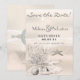 Sand och Sepia Tones Dreamy, strandbotten som visar havsskummet på sanden - en stjärnfisk, korall, ostron med pärlor inuti och ett hav snigel vid förgrunden. Gör att du vill sparka av dina skor och springa till stranden - Perfektens destinationsbröllop eller andra party inbjudan - all text som fält är anpassade, för att byta till vad som än har party.