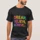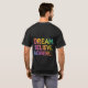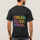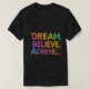T-shirt-designen innehåller texten "Dream. Tro. "Uppnå.." i en övertoning av vibrerande färg, med abstrakt och mönster som omger det. Utformningen är djärv och öga-fångstande, och färg är ljust och glatt. Texten skrivs med fet stil och ord är jämnt fördelad. Konstruktionen är centrerad på t-skjortans bröstkorg och omges av en vit gräns. Utformningen är enkel men effektiv, och den kommer säkert att fånga öga från alla som ser den.