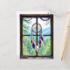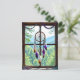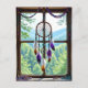 Boho vycard för att säga hej och behålla i kontakt med en vän eller familjemedlem.. Ett strålträfönster med en vit, orange och lila dammluckor hängande i fönstret tillsammans med en sträng med färgstarka kristaller. Fönstret förbiser en vacker plats av skog och berg.