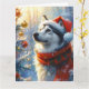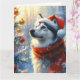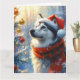 En drömmande julfärgsscen med en festlig Alaska Malamute som bär en julhatt och röd sjalj på vintern. Innehåller ett originellt roligt julmeddelande som hundälskarna säkert kommer att sända till kärlek.
