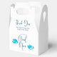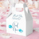 Dreamy och bohos pojkens barnduschförmånslåda med vattenfärgad illustration av turkosa blå moln. I texten står det: "Vi är på molnet nio."