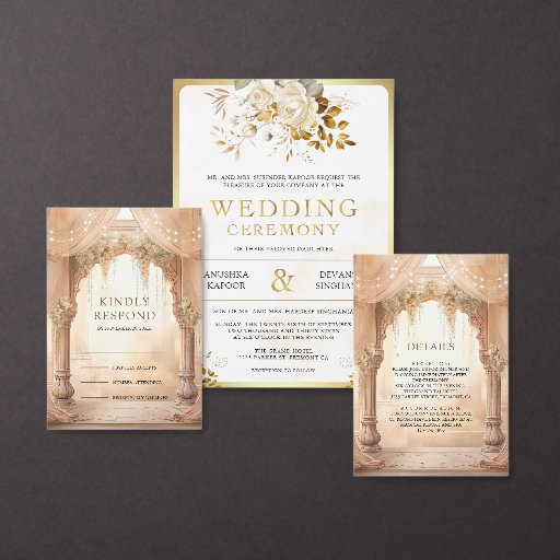 Amaze your guests with this elegant Indian wedding invite featuring beautiful arches decorated with curtains and cream flowers. Modern gold typography with QR Code for online RSVP. Simply add your event details on this easy-to-use template to make it a one-of-a-kind invitation.