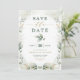 Den här eleganten, botaniskt temat Spara datumkortet, har vackra vattenfärgsgröna löv i grönt och guld och elegant typografi som kombinerar modern ren text och en aning kalligrafi