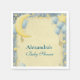 En drömfärgsdesign med en glödande halvmåns måne omgiven av hängstjärnor, fluffa moln och festila ballonger i mjuka skuggor av blått och guld. Perfekt för att skapa en magisk och känsloinspirerad babydusch.