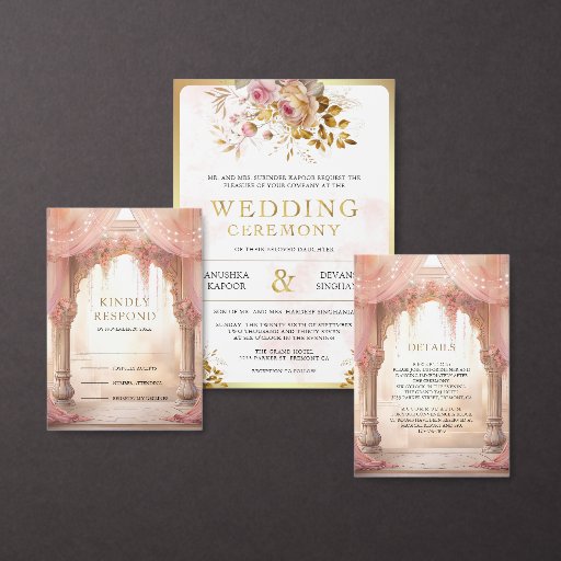 Amaze your guests with this elegant Indian wedding save the date featuring beautiful arches decorated with curtains and pink flowers.