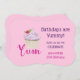 En födelsedagsinbjudan med ett sött tema. Designad med en rosa cupkaka med skummande virvlar av rosa som frodas med en gult cupkakhållare. En hallon med stjälk och löv på toppen. Drömlig och utsökt. I texten står Yum i trendiget finare. Ställ in på en pastellbaksida för rosa.