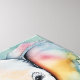 This charming artwork features an adorable baby elephant rendered in soft, delicate watercolors, with delightful pastel hues coloring its ears. It stands gracefully against a beautifully diffused watercolor background in gentle shades of blue, pink, and yellow, creating a peaceful and dreamy atmosphere. Subtle golden flecks at its feet add a touch of magic.