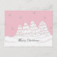 En mjuk rosa bakgrund med drömmande vit Julgranar med mycket litet ljus, flytande snö täckta toppar och lite snöflingor kommer ner.
