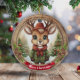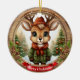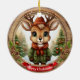 Dressed Whimsical Reindeer Fun Holiday Season Personalizable Rustic Xmas Pine Wood Decor. Framed Wooden Custom name Doe Decoration. Personal Name Gift Tag. Winter Wonderland Woodland Wildlife Deer with Antlers Character Ceramic Ornament! Featuring customizable white text saying "Merry Christmas" on a vibrant red ribbon – easily swap it out for a loved one's surname to make a truly personalized artwork for tree with charming accents of pine cones and evergreen branches for that cozy look. At the center is a festive cartoon graphic, wearing a coat, hat and scarf, evoking the spirit of an animal with a cute twist. The background showcases an enchanting snow landscape complete with a snowy trees. This two-sided, personal pine wood artwork ensures seeing the adornment from every angle – illustration appears on both front and back, so it always looks complete no matter how it spins while hanging. Perfect for gifting or decorating, and you can transfer this unique design to a variety of other products, from mugs to cards and more! Personalize your pinecone embellishment and bring home this delightful fawn keepsake today – visit Zazzle to customize and order now! 🦌🎄