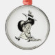 Förtjusande svartvit tecknad av en liten flickauppklädd i stor hatt, högklackar och mycket lång klänning