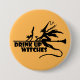 Utformning med orden "Drink up Witches" som innehåller en häxa på en stam med en katt och en martini.