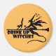 Utformning med texten "Drag upp vitsar" som innehåller en häxa på en bomme med en katt och en martini.
