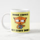 DRINK COFFEE FÅR SAKER GJORT Cute Cat Giant Coffee Mugg. Det här kaffet mugg har en söt tecknad i orangen som håller sin mugg kaffe. Ordalydelsen lyder DRINK COFFEE GE SAKER GJORT. Så sant!