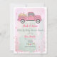 Drive thru baby shower inbjudan med en illustration av en rosa lastbil dekorerad med vimplar och fylld med leksaker och paket. Bakgrunden är vattenfärg inspirerad med konfetti illustration.