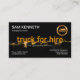 I ett svart hölje strömmar en ljussken av lysande gult genom kortets ansikte med den underliggande skylten "lastbil för uthyrning". Nedan finns parollen "Din blixtresponsdrivrutin" som du kan ändra för att göra reklam för dina tjänster. Ett andra sloganalternativ finns i det nedre högerna. Norrut till detta är en logotyp i guld lastbil som man kan använda. I motsatt riktning ljuger du ditt prestigefyllda namn och din befattning medan kontaktuppgifter ligger söder om basen.