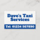 Affärskortet Taxi Services för att en Taxi-förare ska kunna lämna till kunder. Taxi illustration med fet telefonnummer på båda sidor av affärskortet.