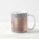 Modern, giftig silver glitter droppar namn och kaffe mugg i monogrammet. Den här designen har silver grått (grått) glitter gnistra droppar på faux rosa ros guld med brusad metall med anpassningsbar personlig som första och första namn-textmallen. Underbar kvinnlig girogåva till flickvän, mors dag, födelsedag, bröllop, möhippa, söt 16 födelsedagsfester, företag, professionell arbete och till alla som tycker om söt glamourous shiny sak. Observera att den här designen är en utskriven fotoeffekt utan äkta glitter.