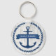 Nyckelkedja för din båt nycklar med en mörk blått nautiska ankare omgiven av ett rep gräns på en lätt grått-drivträbakgrund. Över ankaret finns ett blått band med en mall fält för båtens namn. Mörk blått tillbaka.