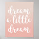 Denna söta citat affisch har uttrycket "dröm en liten dröm" i vit text. Bakgrunden har en subtil rosa ombre effekt. Perfekt för en barnkammare eller sovrum! Också en bra present.