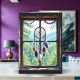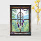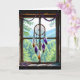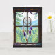 Ett vackert kort med tankar om dig till en vän eller familjemedlem. Ett rustikt träfönster med en drömmfångare i vitt, orange och lila fjäderhängande i fönstret tillsammans med en sträng färgglada kristaller. Från fönstret har man utsikt över en vacker vy med skog och berg.