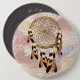 Ett drömfångare-design med guldbeslag och bruna detaljer som inkluderar en rund bambukrans med livets nät av bruna fjädrar och röda pärlor på en mjuk fjäderbakgrund.