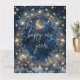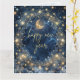 En mystisk nattlig scen med en lysande halvmåne inklädd i gyllene stjärnor och himmelska mönster, mot en djupblå kosmisk bakgrund. Ömtåliga gyllene ornamentala detaljer inramar utrymmet för ditt personliga meddelande och skapar en atmosfär av magi och möjlighet.