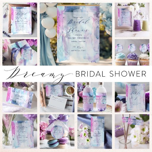 Bjud in familj och vänner till din bröllopsfest med vårt inbjudningskort med riktig vattenfärgskonst med drömmiga nyanser av rosa, lavendel och marinblå.