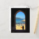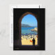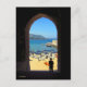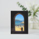 Ett vykort från en man står i skuggorna av en gammal arkway tittar på ett vackert strandområde i Cefalu på Sicilien. Digitalt fotografi av Sue Melvin