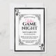 Den här inbjudan till Dam Game Nght-partiet har en klassisk spelkortsdesign på vit bakgrund. En ornat, vintage stil ram, omger mitttextområdet. En matchande svart folie utformar inbjudan i ram gräns. Två svarta diamanter och drottningens monogram trycks i motstående hörn, liknande layouten i en kortlek. Ord "dam" skrivs ut i ett söt rosa-skriptteckensnitt ovanför titeln Spelnatt.
