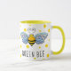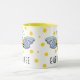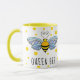 Denna kaffemugg presenterar en illustration av ett honungbi med gult, och den görade randig svarten förkroppsligar, och blåttvingar på en bakgrund av gult pricker. Ord "drottningbi" kan lämnas, som är eller personligen. Designat vid berömd konstnär©Tim Coffey för värld.