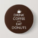 Knapp för roligt av kaffe och nötter älskare med kaffe kopp med "DRINK COFFEE OCH EAT DONUTS". Utformning baserad på den brittiska moralen från 1939 poster "Håll lugn och fortsätt". För kaffe älskare.