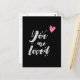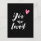 Idévykort med frasen "Du är älskad" i ett vitt penselskript med organiskt bläck struktur för att få ett autentiskt, handskrivet utseende och ett rosa hjärta.