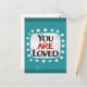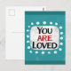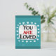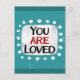 "Du är älskad" är ett snyggt inspirerande eller motiverande citat med en vit accentform omgiven av vita texturerade fantasifulla prickar.