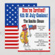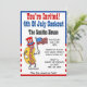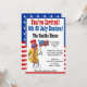 Du är inbjuden till en 4 juli grillfest med en rolig, tecknad korv som bär en stjärnor och ränder hatt och håller en amerikansk flagga. Få alla i feststämning med den coola självständighetsdags inbjudan. Det är bra för alla fjärde juli familjegrillning. På baksidan är stjärnor och ränder. Färgrik röd, vit och blå.