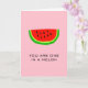 Detta snygga minimalistiska kärleksstils vykort med en rödgrön vattenmelonfruktsektion tecknad illustration och anpassad text "du är en i en melon (miljon)" på en ljusrosa bakgrund är ett trevligt val för Alla hjärtans dag eller speciella tillfällen som födelsedag, bröllopsdag etc. Anpassa texten som du vill för att göra det personligt.