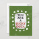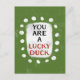 Fet text som lyder "Du är en lycklig anka" är centrerad mot en grön bakgrund. Den orange och svarta texten sitter på en vit rektangel med stora strukturerade vita prickar runt omkring, vilket ger en lekfull kontrast mot den enfärgade bakgrunden.