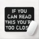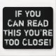 Ett lustigt citat i ett olyckligt teckensnitt. Frasen lyder: Om du kan läsa detta är du för nära.