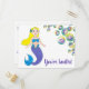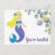 Postkort med en originalillustration av en söt blond sjöjungfru flicka i blå och lila kläder, omgiven av färgglada bubblor. Anpassa helt enkelt texten för en unik fest eller evenemang inbjudan.