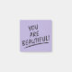 Du är vackra positiva Post-it-lappar. Lavendelfärgade lappar med ett djärvt positivt budskap och ordet vacker understruket för att betona den betydelse det har. Fantastiska positiva lappar för dig att använda både som en påminnelse för dig själv och dina vänner. Bra användning för dessa underbara lappar skulle vara att placera dem på olika platser du besöker och förvandla dem till små vänlighetsgärningar varje gång en slumpmässig person, vare sig det är en främling eller någon du känner, ser dem.