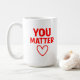 Börja varje morgon med ett meddelande som betyder något! Den här keramiska "You Matter"-mugg har fet röd text och en passande hjärtsymbol på en slimmad svart bakgrund. Med en kapacitet på 11 oz är det både mikrovåg- och diskmaskiner-säker. En hjärtlig gåva till vänner, familj, lärare eller någon som behöver en daglig upplyftning!