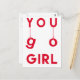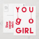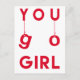 NewParkLane - Vykort, med citat 'You Go Girl' i en rolig, modern typsnitt med hängande bokstäver, i klarröd färg. Baksidan säger: Visa cancer vem som bestämmer! Lägg till namn eller annan text för en personlig design.
