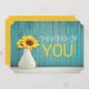 Du är glad när som helst, bara för att hälsning på en vacker turkotisk bakgrund. Den har en färgstark, glad solrosgrupp i ett enkelt, tjockt, vitt vas. Typografiktexten är i linje med gyllene och vita gulter. Kortets baksida är en lysande, matchande, gyllene gult men kan enkelt ändras i avsnittet Zazzle design verktyg. E-posta mig på beachpausedesigns.com om du har några frågor om det här eller någon av mina planer. Andra tillgängliga utformningar.