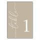 Vår enkla och moderna utformning av bordsnumret är en del av vår Stork-samling, som har guldbruna nyanser och sans serif och handskriven kursiv typografi.