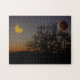 Dubbelförmörkelser förbryllar solnedgångfantasi med lunar och sol- förmörkelser och ett silhouetteträd