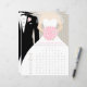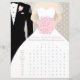 Elegant grafisk brudgum med smoking och brud med slöja som håller en bukett med rosa stiliserade rosor bröllopsdusch klassiskt ordsöksspel på ena sidan och råd på baksidan. Redigera detta roliga bröllopsspel och rådgivning med din bruds namn. Dina gäster kommer att ha massor av kul när de söker och hittar vanliga bröllopsrelaterade ord med hjälp av ordnyckeln, perfekt för att ge ett pris till den snabbaste gästen som klarar det. Din brud kommer att njuta av att läsa visdomsorden från sina gäster. Unik design och grafik av Sarah Trett för www.mylittleedenweddings.com på zazzle.