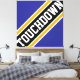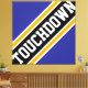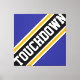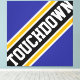 Den här sportfotbollsdesignen har en atletisk TOUCHDOWN-text inuti markerad diagonal svart, vit och gyllene gult tävla rand mot royalets blå bakgrund. Det första och sista breven i texten springa på kanten som är utformat med en dynamisk banderoffekt. Färg och text i den här utformningen kan vara personlig.