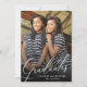 Modern Dubbla Studenter Studentfest-inbjudan. Designen har ett foto av två studenter framtill, typografiskriptet "Studenter" i trendigets vita bokstäver, namn och klass av. Anpassa ytterligare med information om party och ytterligare två foton, uppgifter om skola/högskola/universiteten och större på baksidan.